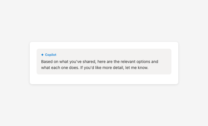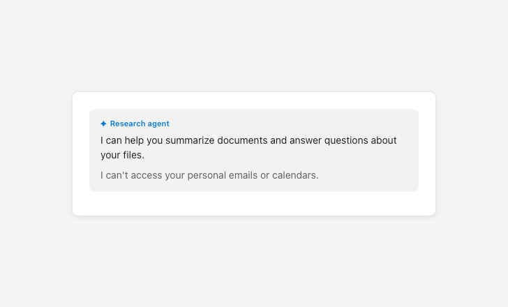 | 3 — Ideal scenario | UI uses content design-approved content for tooltips, prompt bar text, and disclaimer text. All information sources used to generate AI’s response are clearly represented. AI presence and limitations are conveyed at all entry points. UI clearly communicates level of autonomy for agents by listing their triggers, access permissions, and action rights. |