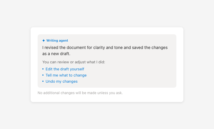 For agents: let users know when they’re activating an agent. Express its autonomy level by communicating its triggers, access permissions, and action rights.