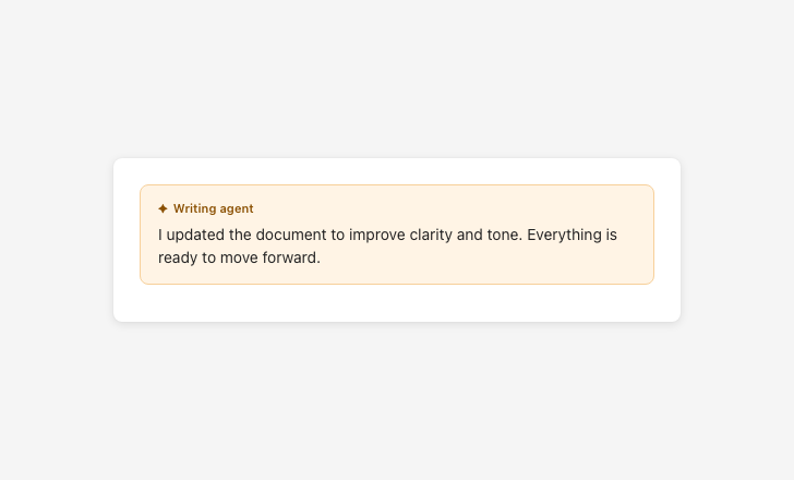 Always inform the user whenever an agent is activated and communicate its autonomy level — its triggers, access permissions, and action rights. Use consistent naming and visual cues for agents across products. Ensure users can approve or reject agent actions before they happen.