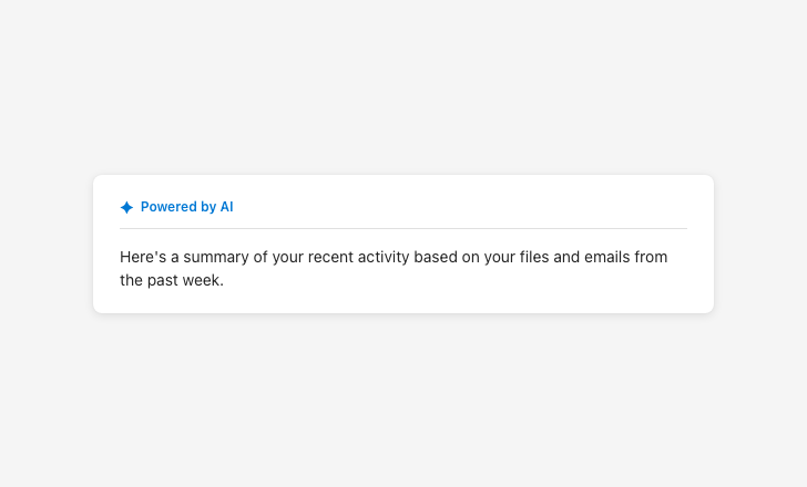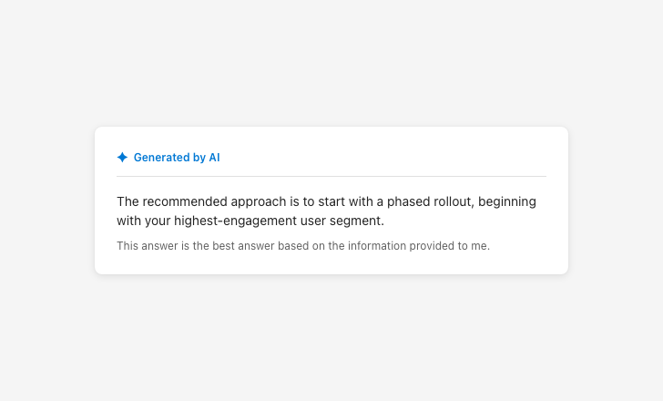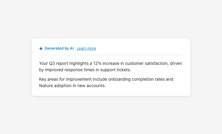 | 2 — Satisfies MVP | UI sets realistic expectations for AI-generated insights, recommendations, and actions, but not within the context of operation. UI sets some context for entry points to the AI experience. |