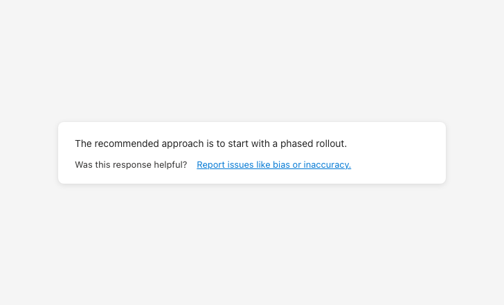| 3 — Ideal scenario | A well-designed, comprehensive feedback collection mechanism allows users to provide RAI-related feedback with the ability to categorize feedback types (e.g., harmful, inaccurate, incomplete, biased, inappropriate content). |