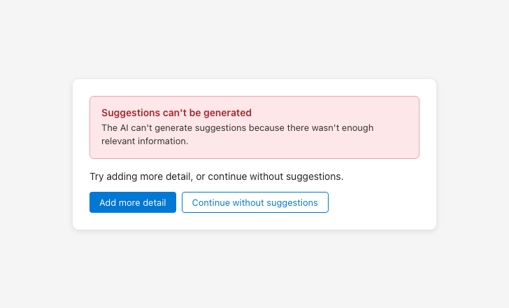 | 2 — Satisfies MVP | Context-appropriate RAI error messages are included, but they’re missing follow-up actions to recover from the error, or the language isn’t approved by content design. |